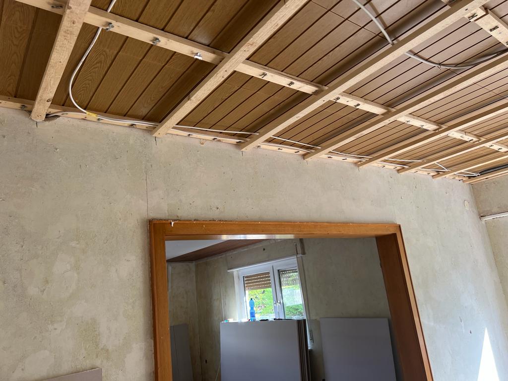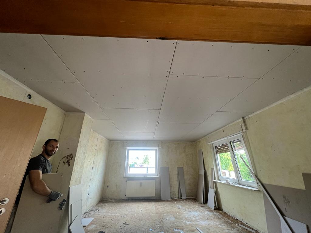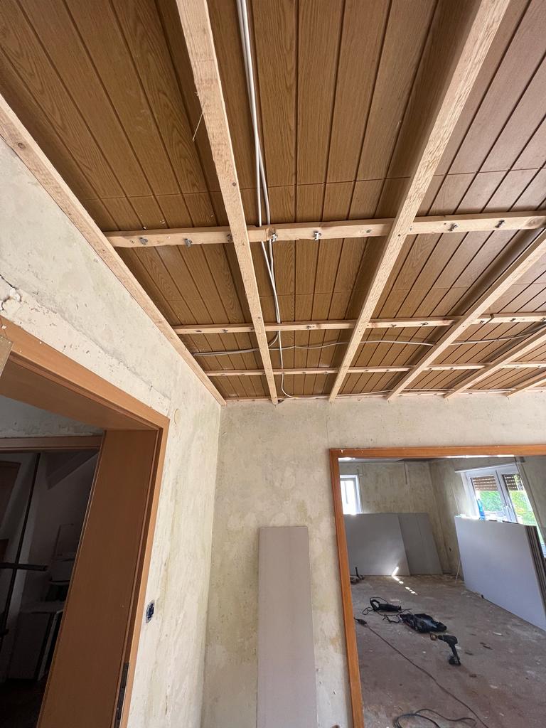 In Dutweiler haben wir den Einbau einer Gipskartondecke (GK-Decke) umgesetzt. Diese Bauweise bietet gleich mehrere Vorteile: Sie schafft eine glatte und homogene Deckenfläche, ermöglicht das Verbergen von Installationen und dient als Grundlage für weitere Gestaltungsschritte wie Streichen oder Tapezieren.