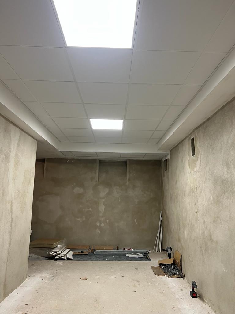 Das Ergebnis ist ein Raum mit klaren Linien, verbesserter Schallabsorption und einer modernen Deckenoptik – funktional und ästhetisch zugleich.