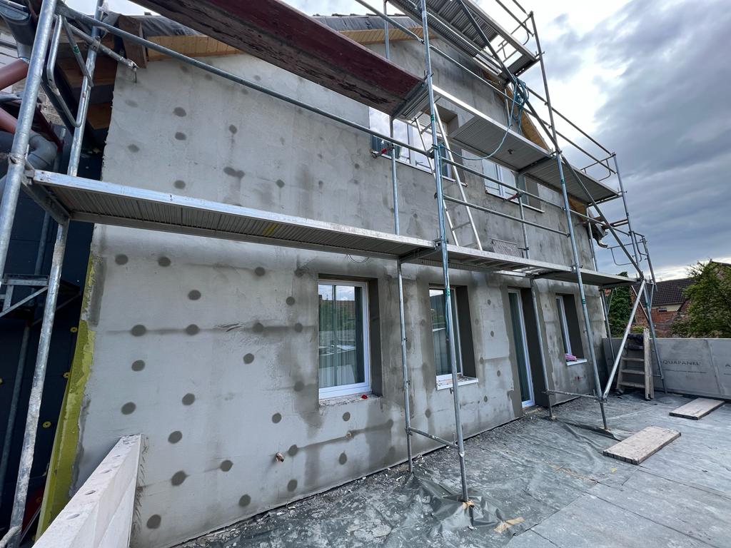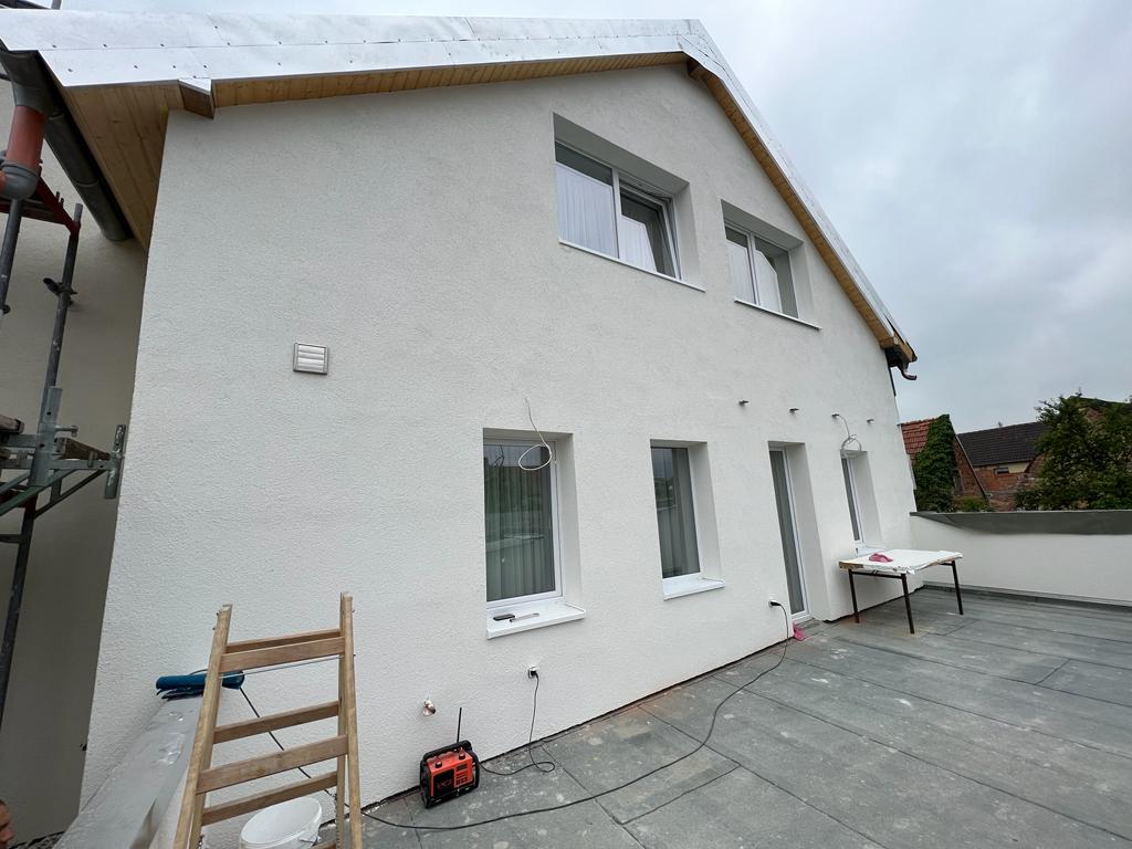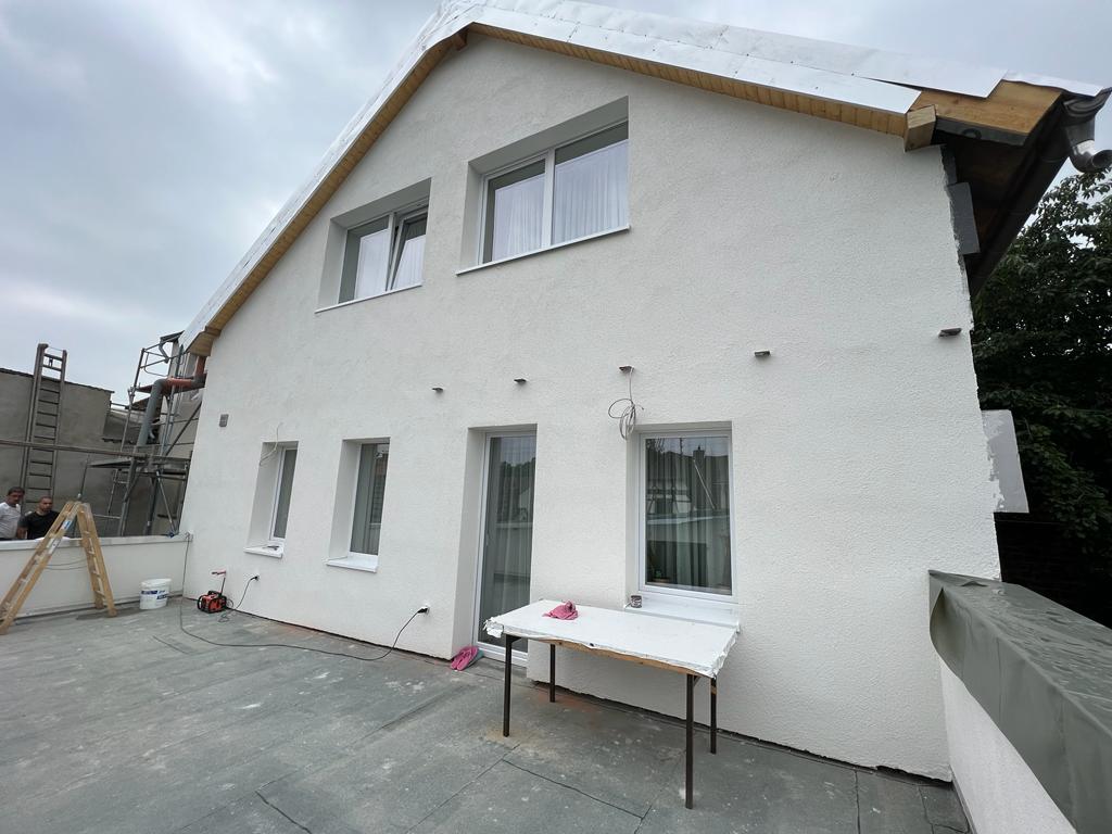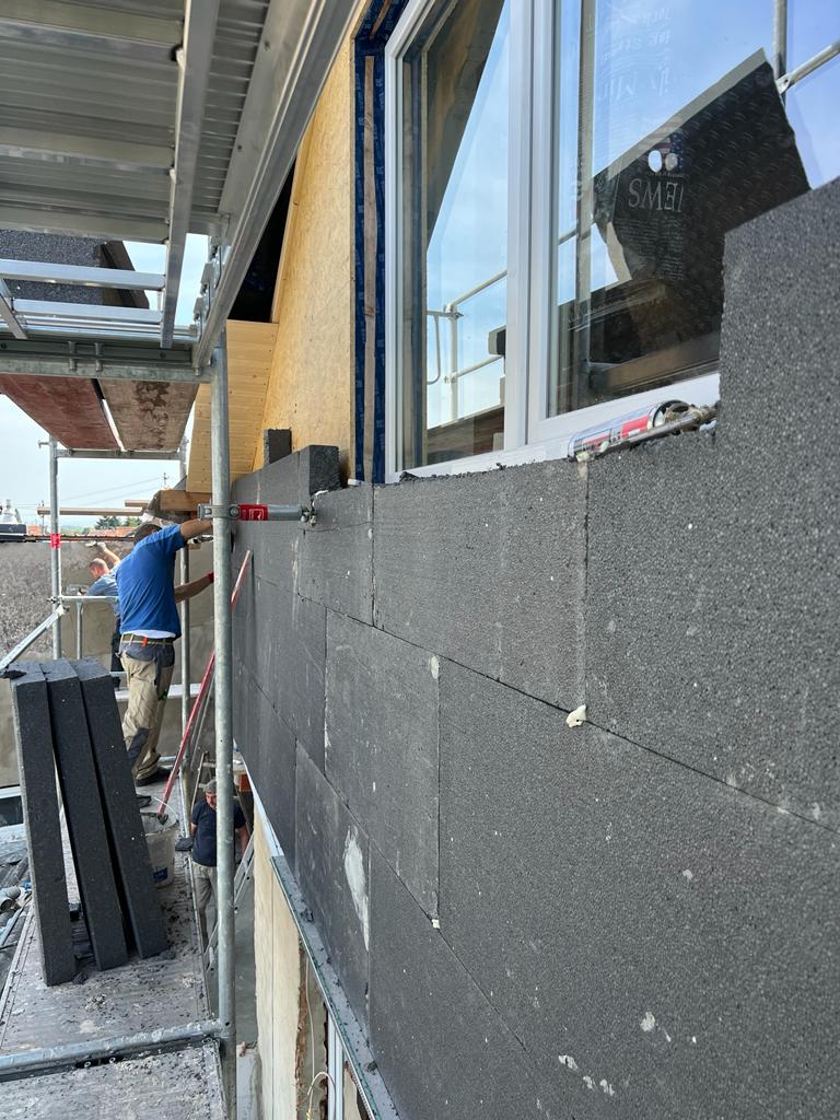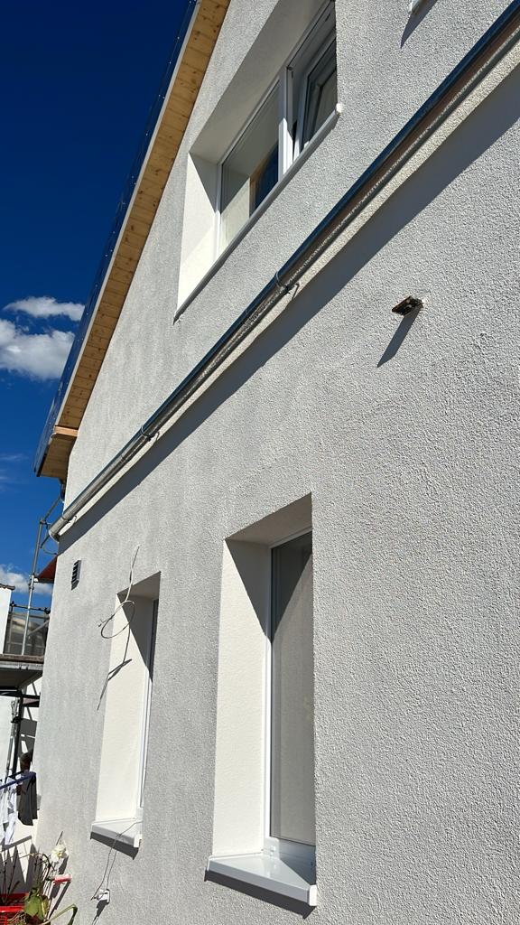 Anschließend wurde die gedämmte Fläche verputzt, um eine stabile, gleichmäßige und optisch saubere Basis zu schaffen. Der präzise ausgeführte Verputz stellt sicher, dass die Fassade nicht nur funktional überzeugt, sondern auch bautechnisch optimal geschützt ist.