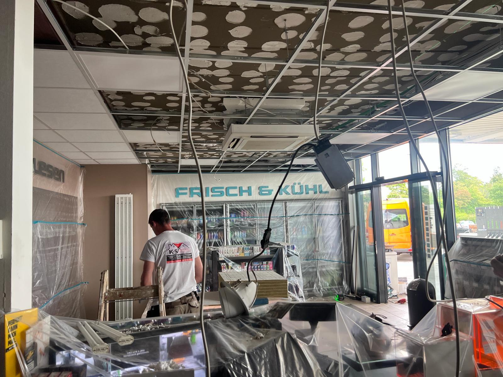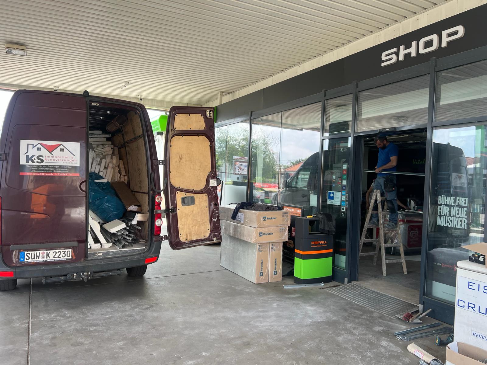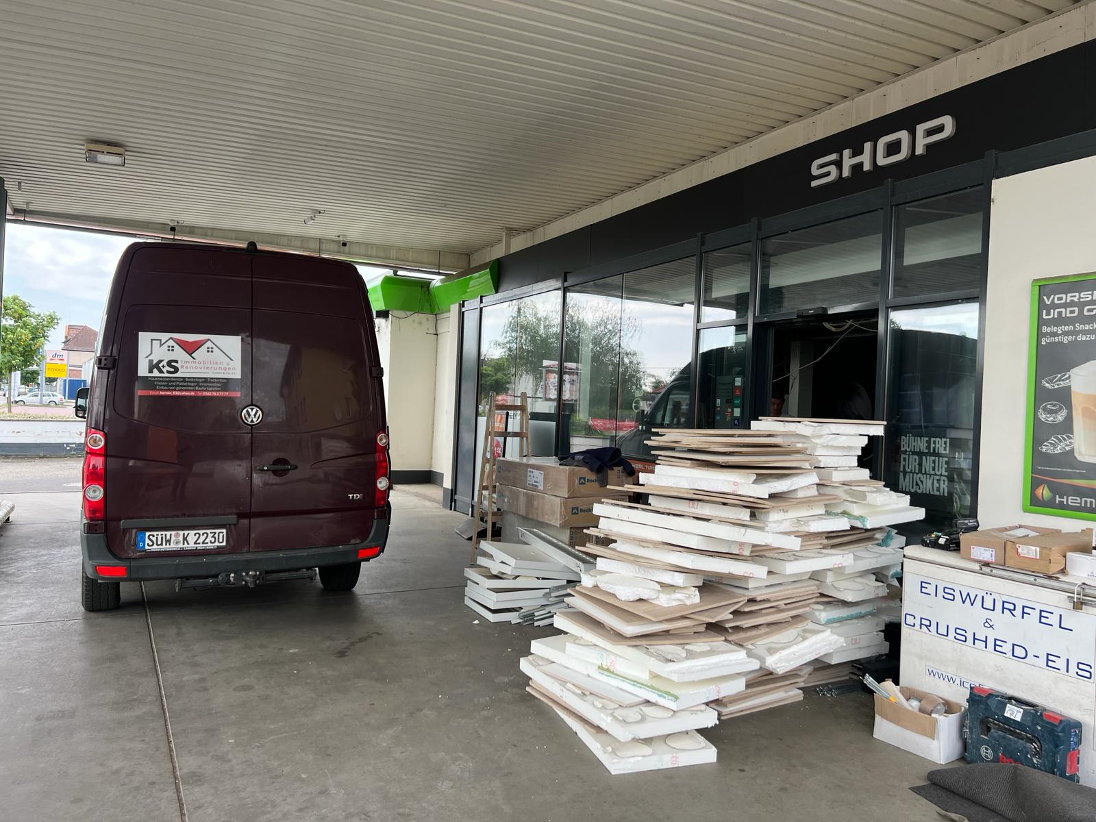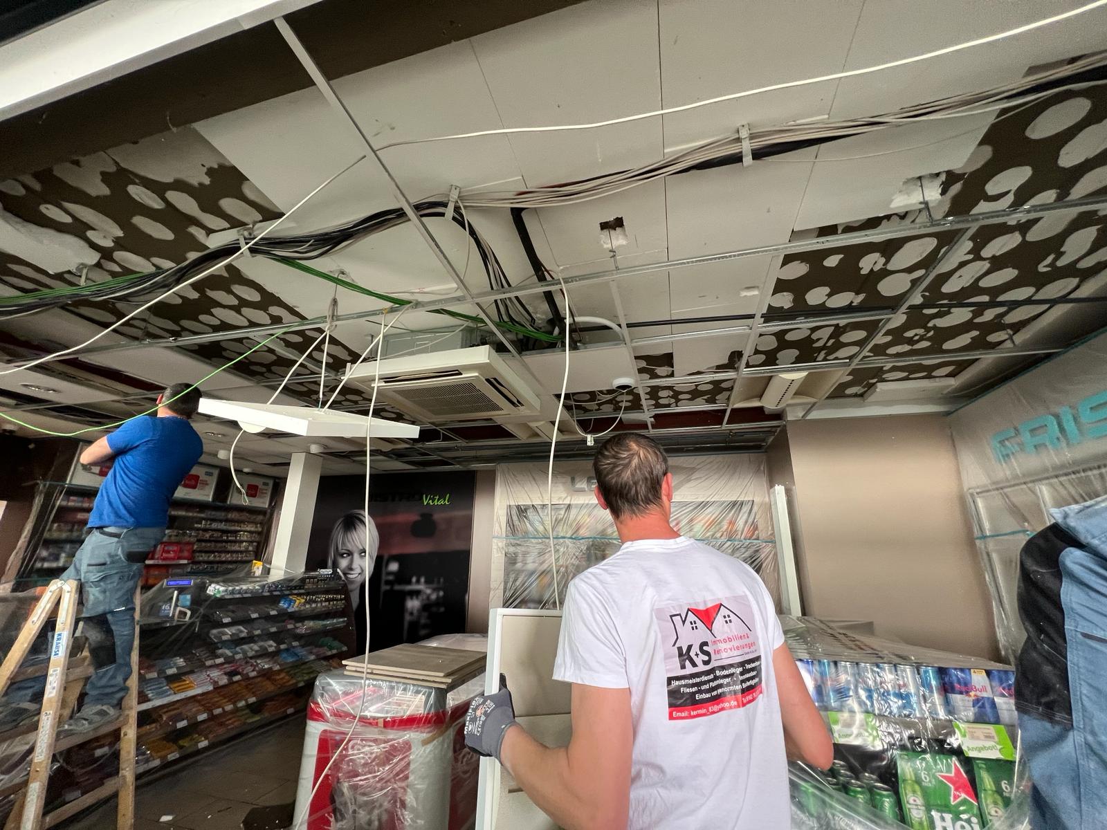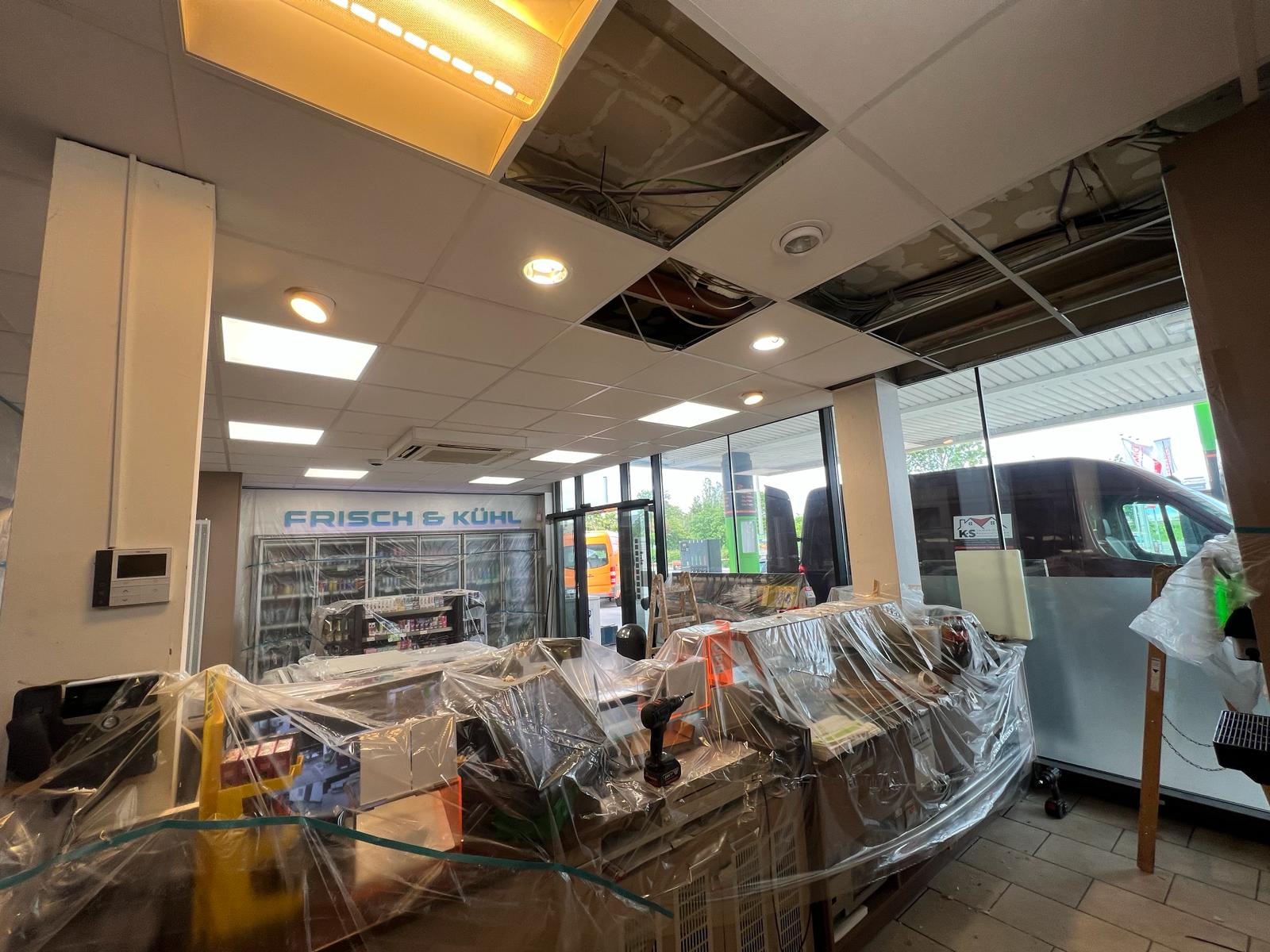 Für die HEM Tankstelle in Edenkoben haben wir umfassende Trockenbauarbeiten durchgeführt. Im Fokus stand die Erneuerung der Decke im Verkaufsraum. Zunächst wurde die alte Deckenverkleidung vollständig entfernt, inklusive der alten Unterkonstruktion.