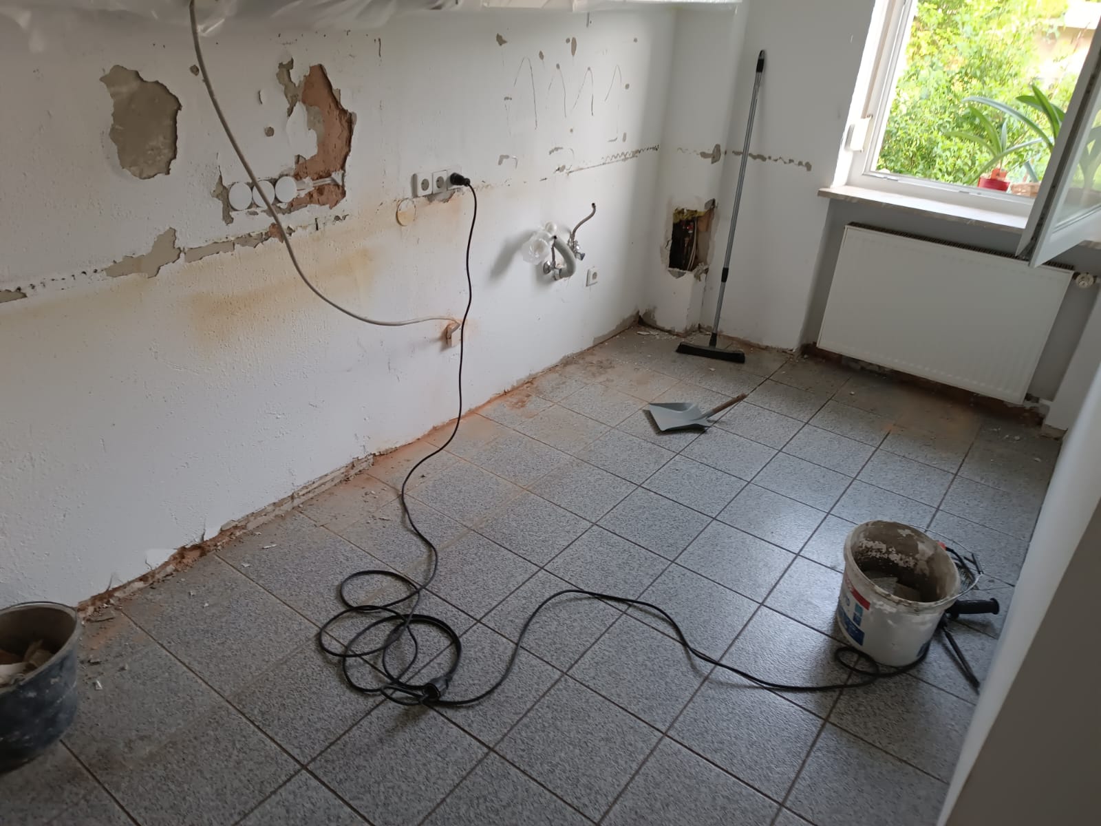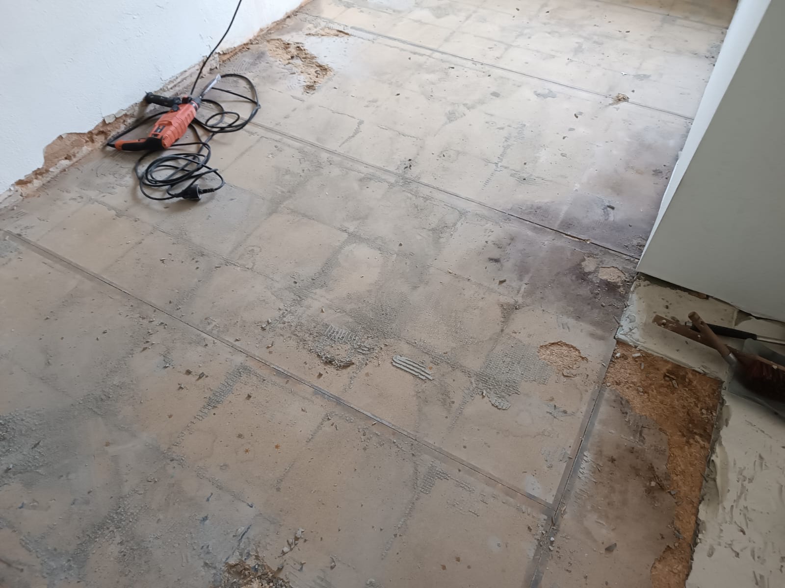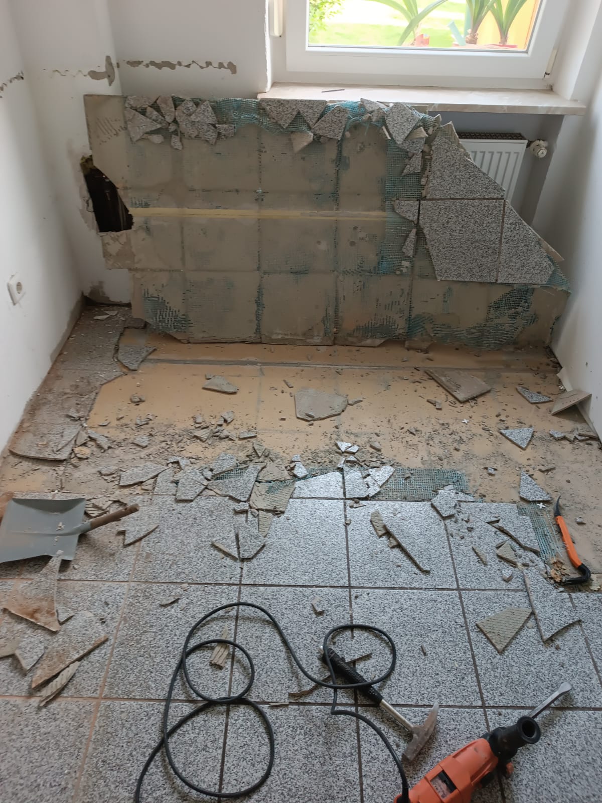 In Landau haben wir alte Bodenbeläge entfernt und durch moderne Fliesen ersetzt. Die Arbeiten begannen mit dem Abbruch der bestehenden Fliesen und der sorgfältigen Vorbereitung des Untergrunds. Dazu gehörte das Glätten und Abdichten der Flächen, um eine stabile Basis für die neue Verlegung zu schaffen.