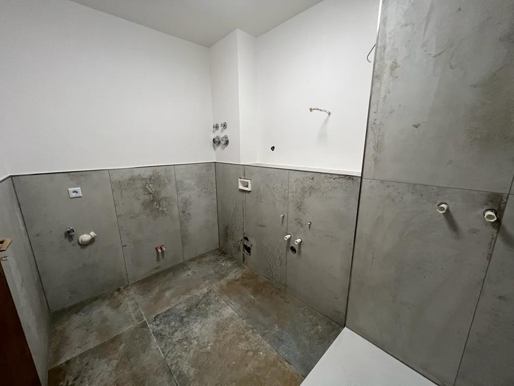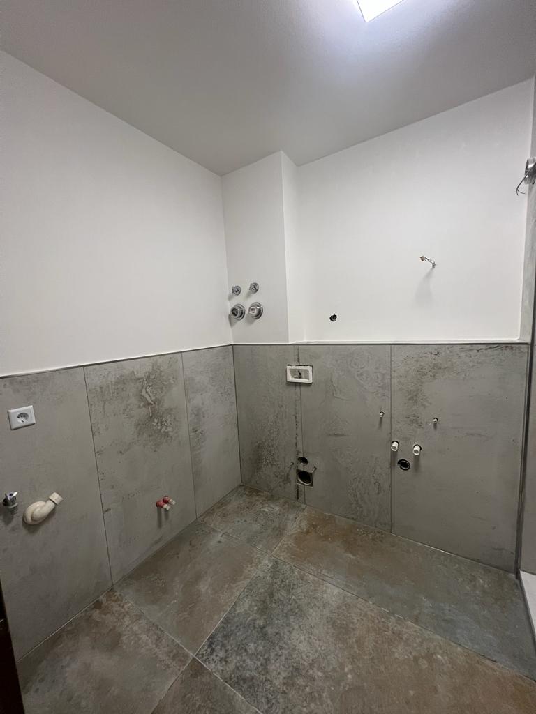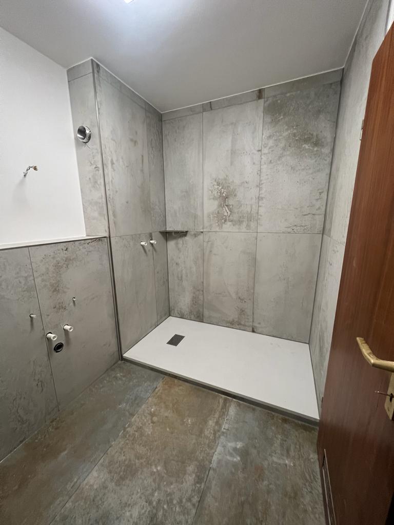 Die Verlegung der großformatigen Wandfliesen erfolgte millimetergenau und sorgt für eine ruhige, moderne Optik. Auch der Duschbereich wurde neu gestaltet und mit einem bodennahen Duschelement ausgestattet, das Komfort und Barrierefreiheit vereint.