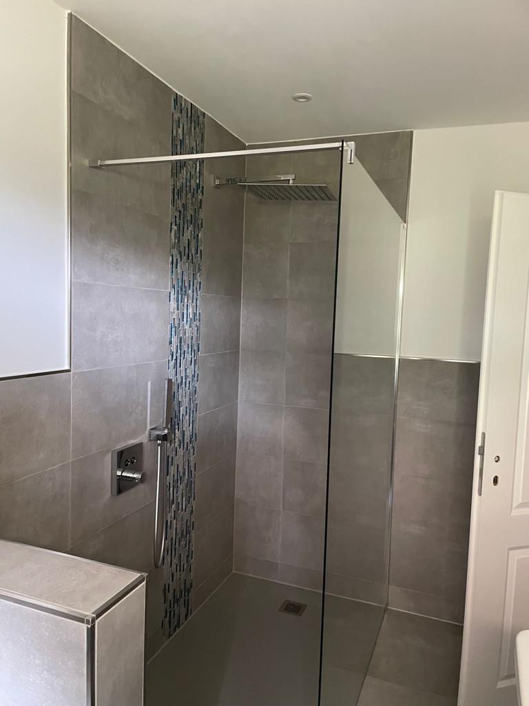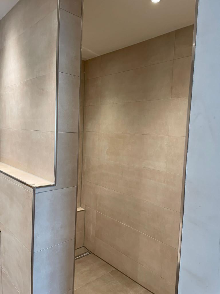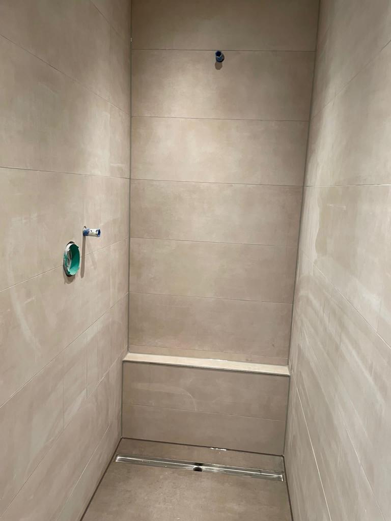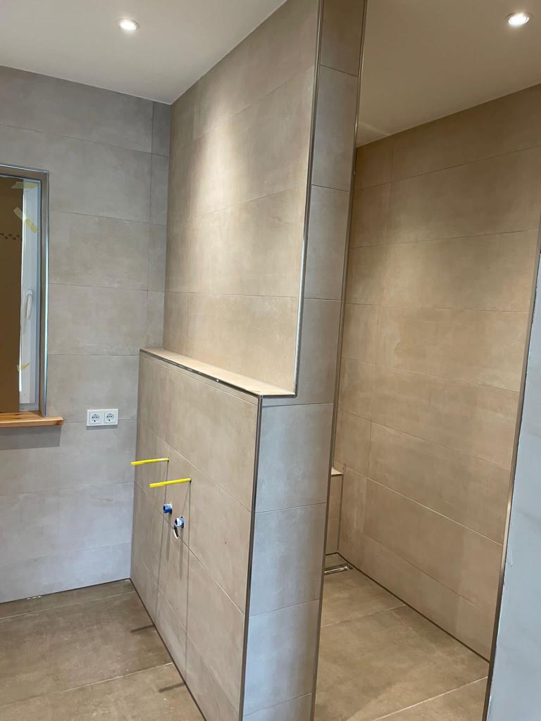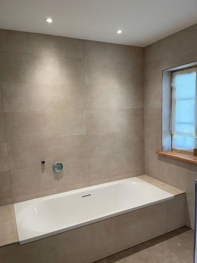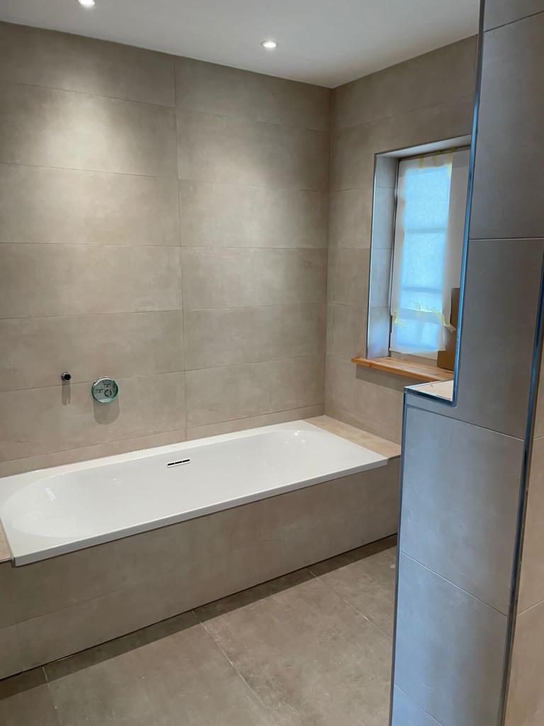 In Neuhemsbach haben wir eine umfassende Badsanierung mit hochwertigen Fliesenarbeiten realisiert. Der gesamte Raum wurde mit großformatigen Wand- und Bodenfliesen ausgestattet, die durch ihre dezente Farbgebung ein modernes und zugleich zeitloses Ambiente schaffen.