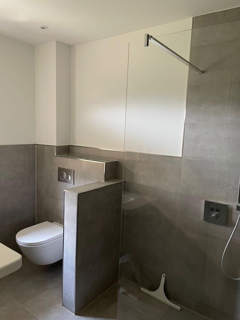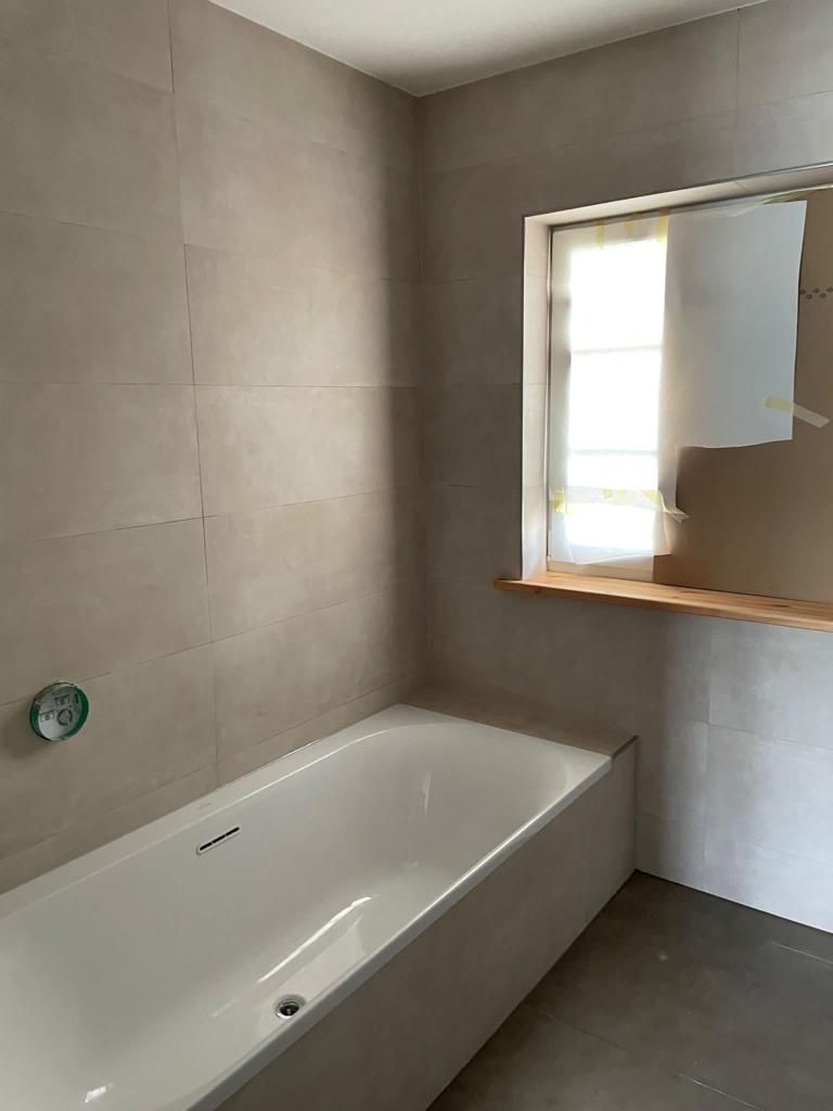 Die Arbeiten umfassten das präzise Zuschneiden und Verlegen der Fliesen sowie die saubere Ausführung der Fugen, um ein harmonisches Gesamtbild zu erreichen. Neben der Badewanne wurde auch eine großzügige Dusche mit Glasabtrennung integriert, die durch ihre klare Linienführung besticht.