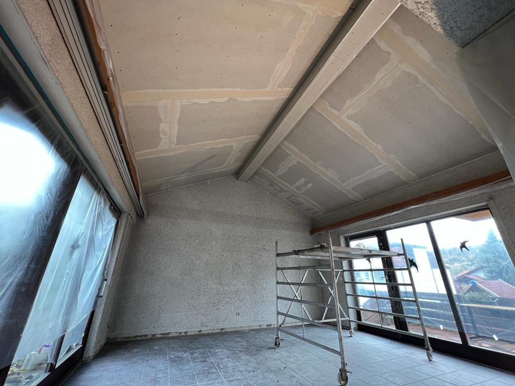 In Niefern-Öschelbronn haben wir den Innenausbau eines Wohnraumes mit einer modernen Gipskartondecke realisiert. Ziel war es, die bestehende Decke optisch aufzuwerten und ein sauberes, glattes Erscheinungsbild zu schaffen, das sich harmonisch in das Raumkonzept einfügt.