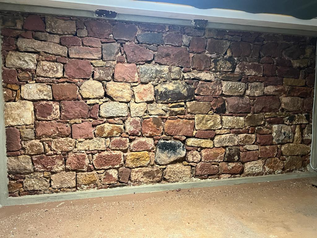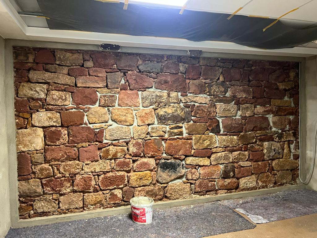 Das Ergebnis ist eine authentisch restaurierte Sandsteinwand, die ihren ursprünglichen Charakter zurückerhält und nun wieder als optisches Highlight des Raumes dient.